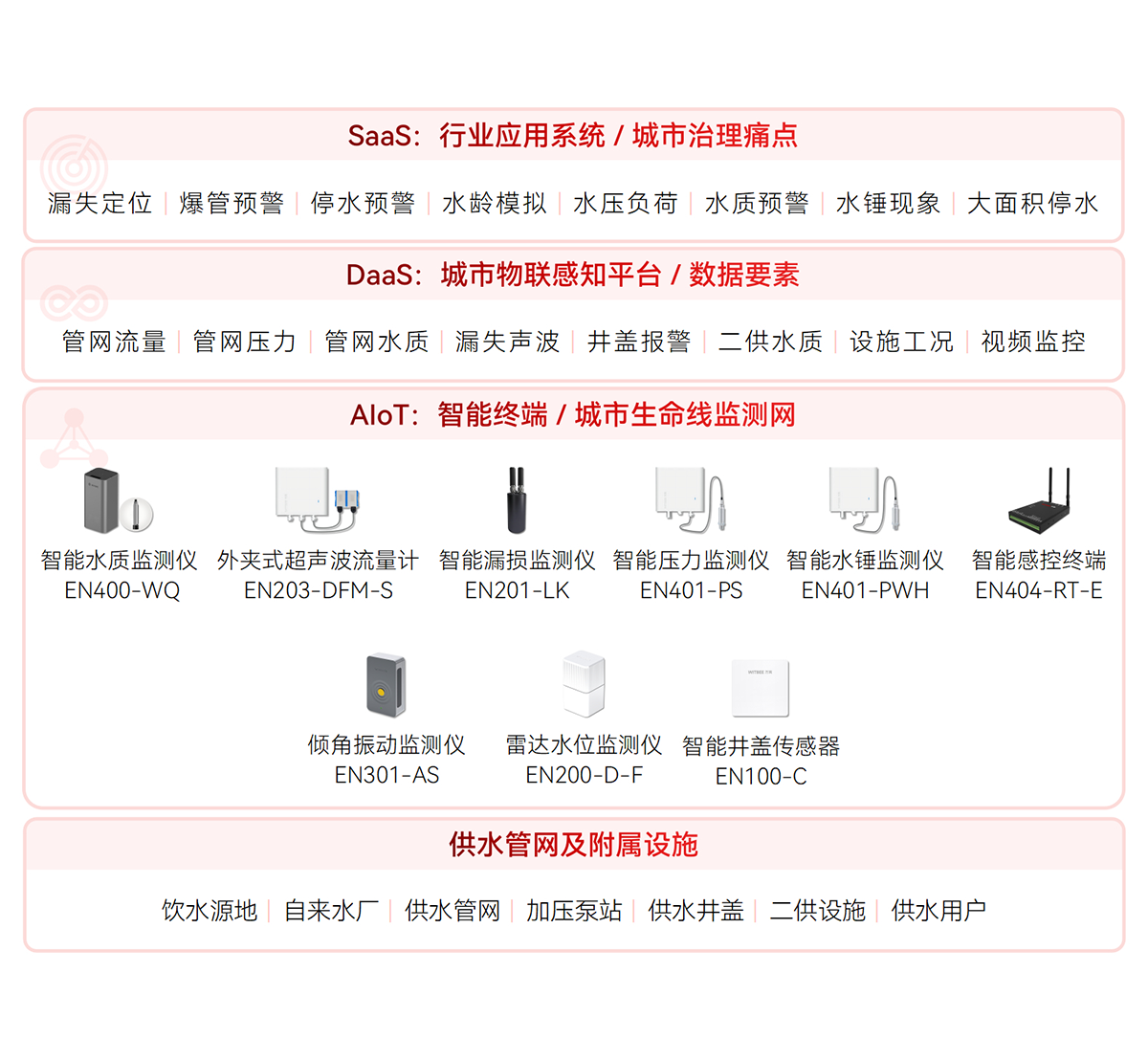 對供水管網(wǎng)設施及水質(zhì)提供實時監(jiān)測,通過各類智能監(jiān)測終端保障供水壓力平衡、流量穩(wěn)定和供水安全,及時發(fā)現(xiàn)爆管并預警,避免大面積城市停水事故發(fā)生,為管網(wǎng)爆管預警分析、用水趨勢分析和泄漏量預警分析提供數(shù)據(jù)支撐。